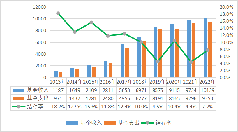 2.基金收支。2022年,居民医保基金收入10128.90亿元,比上年增长4.2%;支出9353.44亿元,比上年增长0.6%,2022年,居民医保基金当期结存775.46亿元,累计结存7534.13亿元。