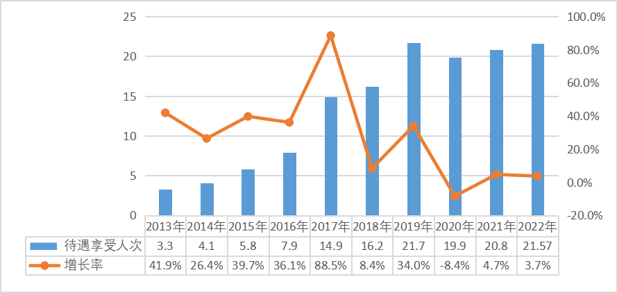 3.待遇享受。2022年,参加职工医保人员享受待遇21.04亿人次,比上年增长3.1%。其中:普通门急诊17.6亿人次,比上年增长2.3%;门诊慢特病2.8亿人次,比上年增长8.3%;住院0.6亿人次,比上年增长6.4%。